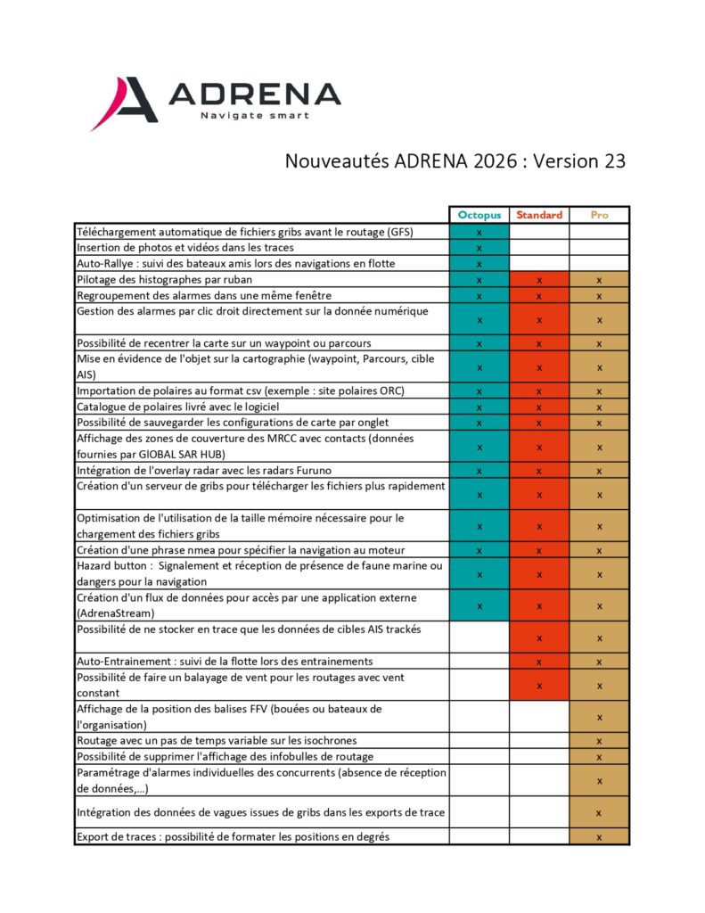 • Sur Adrena Octopus, la fonction « Auto rallye » débarque et ouvre de nouvelles perspectives pour les transats en flotte ou les convoyages groupés. Fini les manipulations répétitives, le téléchargement des  fichiers GRIB est désormais automatisé.