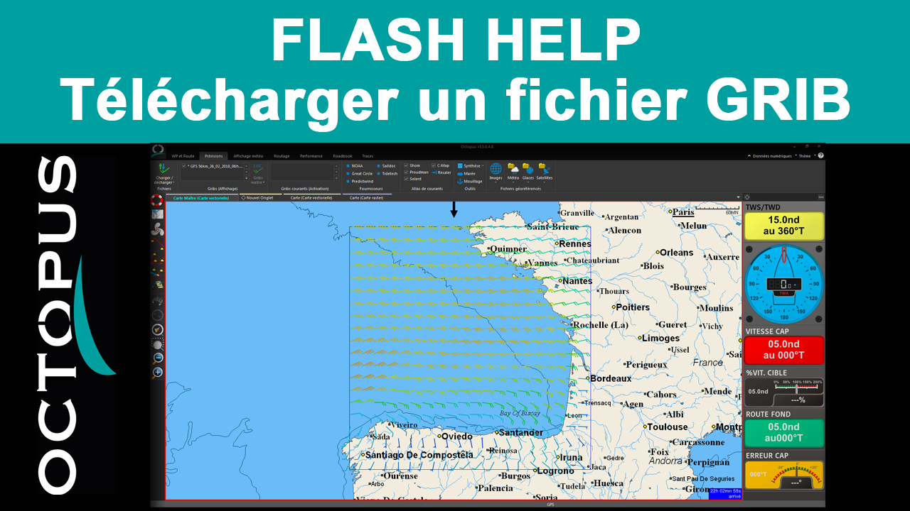 Sélectionner une interface, choisir un modèle, dessiner une zone de navigation sur la carte et télécharger des données… Apprenez en quelques clics comment télécharger un fichier GRIB avec Octopus à l’aide de la vidéo tuto ci-dessous.