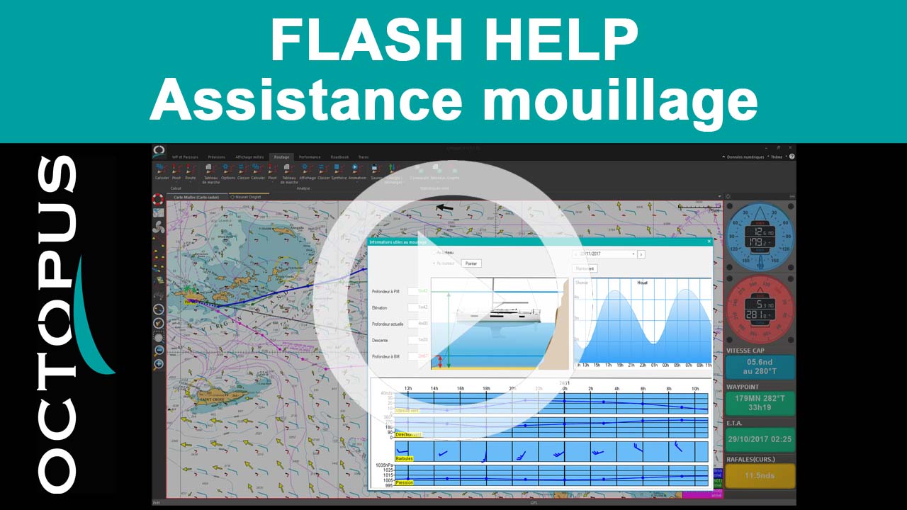 L’outil d’aide au mouillage OCTOPUS vous permet de visualiser en un clic les conditions prévues à l’endroit où l’ancre sera mouillée (météo au mouillage, hauteur d’eau selon la marée, etc.). Apprenez comment l’utiliser grâce à cette vidéo tuto.